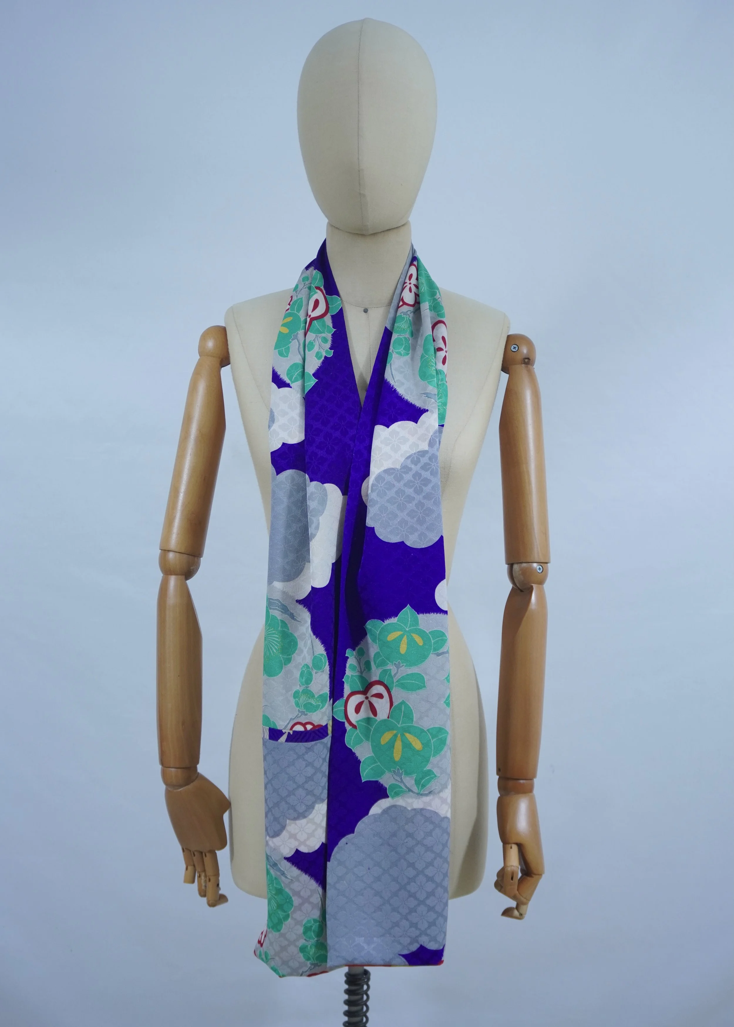 DESCRIPTION: Vintage silk kimono Scarf 2 types of fabric with Purple cloud flower pattern and traditional Japanese pattern.